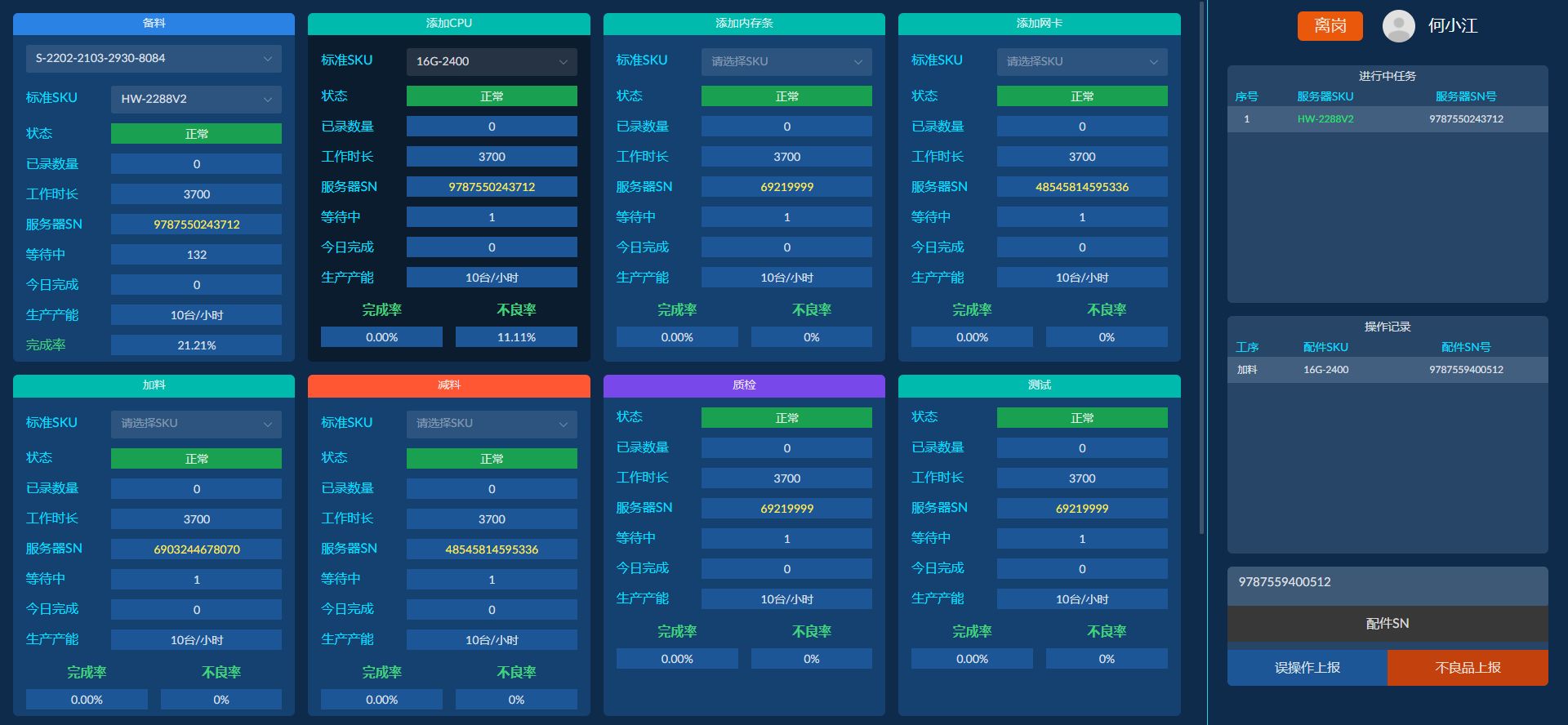 产线生产工作人员,可以通过生产操作端扫服务器SN号及配件SN号进行备料、装配、拆卸、测试、压测、包装、发货等操作。