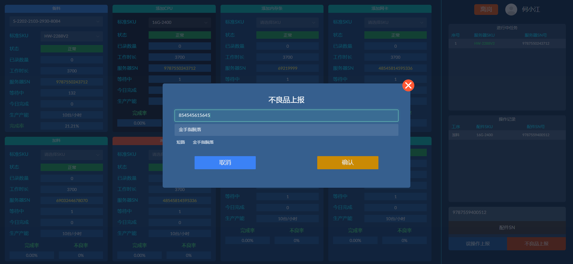 操作员点击不良品上报,然后使用扫码枪扫描不良品SN配件号,选择不良品原因即可快速完成上报